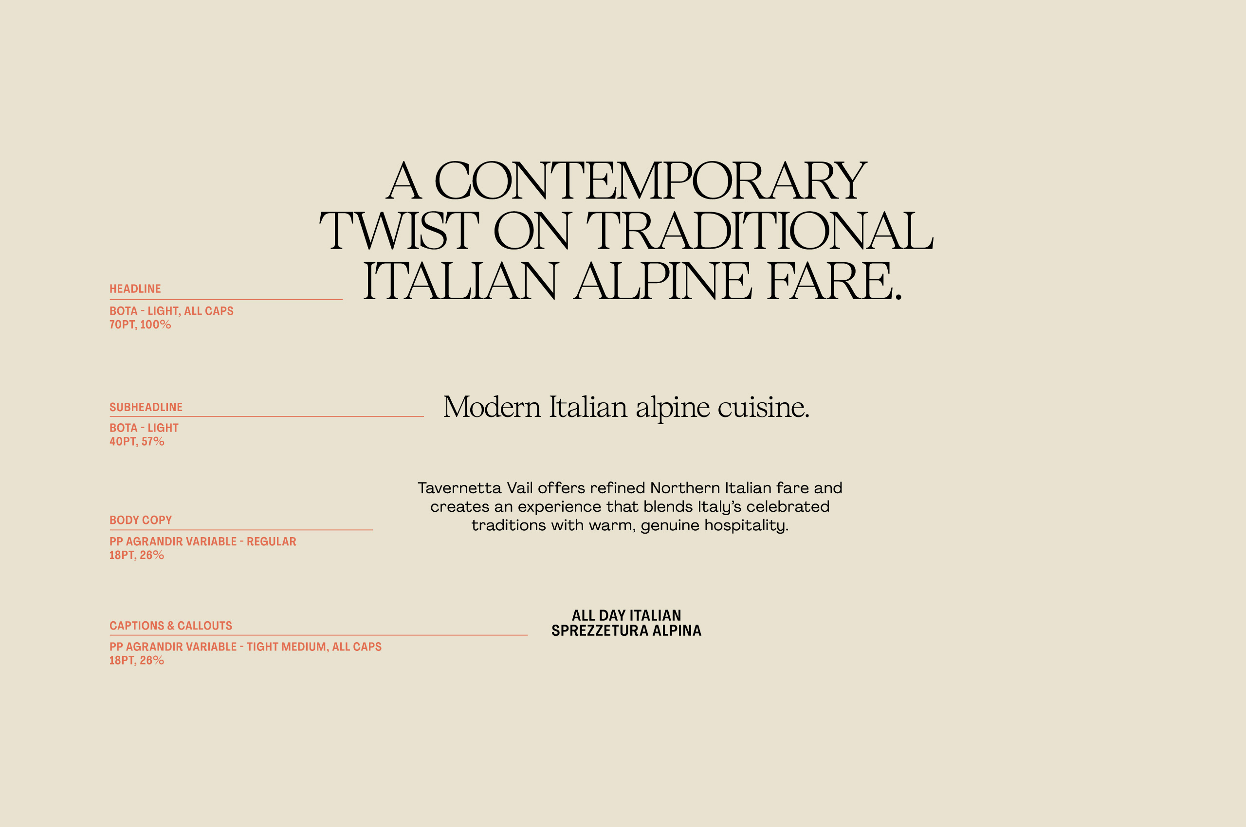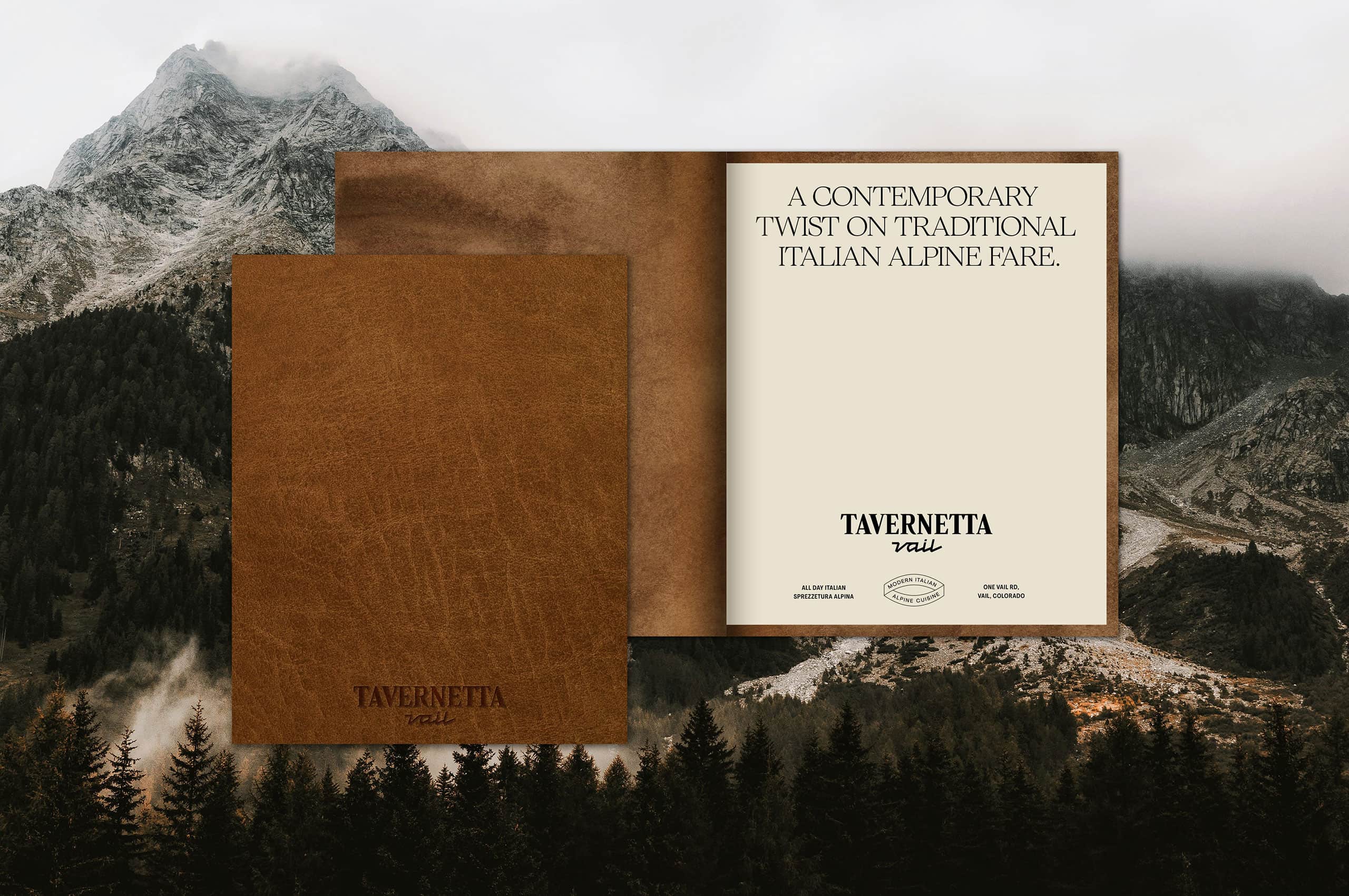 Sprezzatura Alpina is distinctly Tavernetta Vail. It’s the philosophy behind every decision—the refined rusticity of materials, the careful casualness of execution, the balance between mountain and luxury. Sprezzatura Alpina isn’t just a banner mark in the visual system. It’s the entire approach distilled into two words.