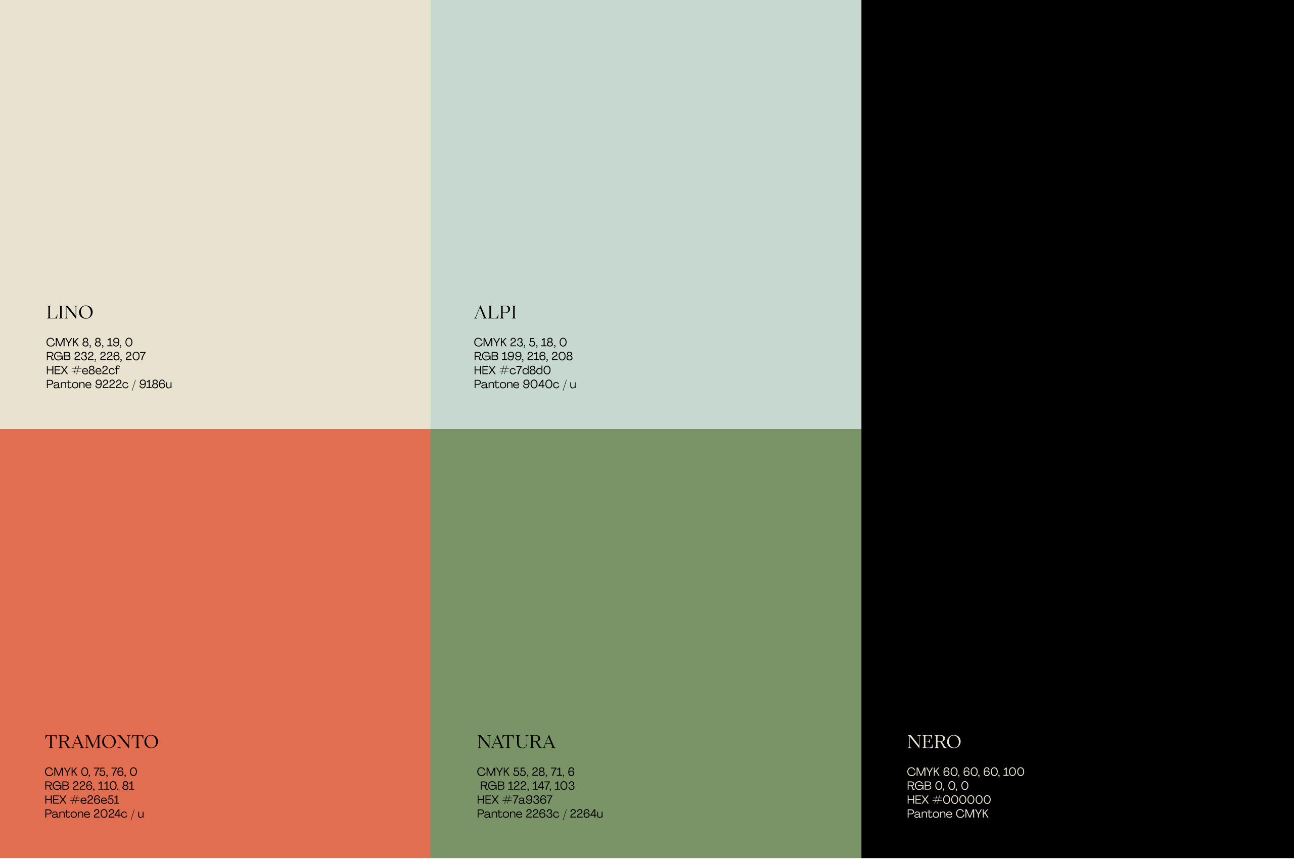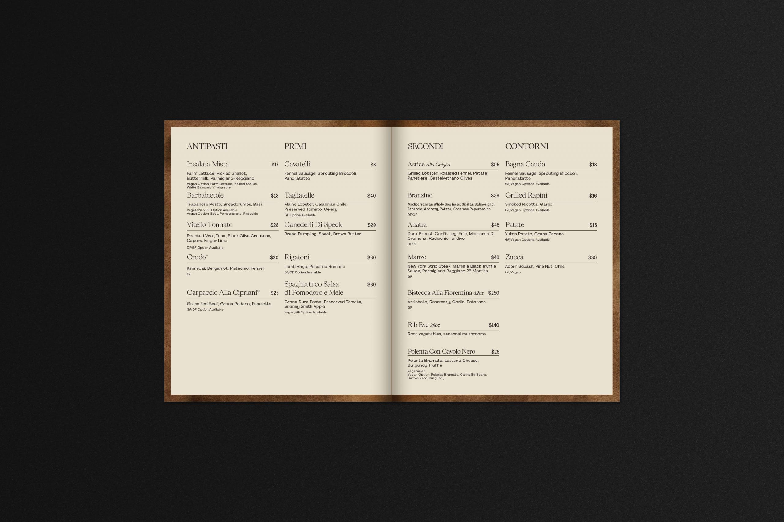The menu system demonstrates how the full identity comes together. Typography, color, and symbols work in concert. The layouts balance what Italian dining demands with what mountain hospitality offers. Structured enough to signal refinement, relaxed enough to feel welcoming.